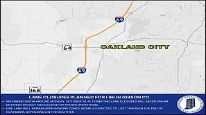 The Indiana Department of Transportation says alternating lane closures are scheduled to begin on I-69 in Gibson County on Monday, October 20th for road paving operations. The alternating lane closures will occur between State Roads 168 and 57 near Mackey and Glezen. Paving operations will begin in the northbound lanes...